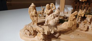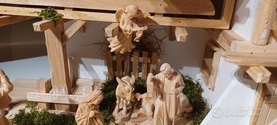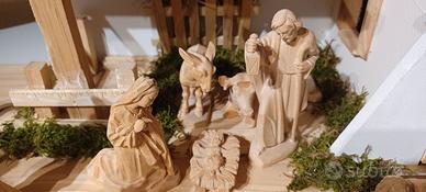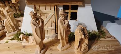 Vendo capanna nuova e statuine in legno, sculture della Val Gardena. Dimensioni capanna cm. 60×30x27(altezza max). Statue altezza 10,5. Tre Magi, Natività, Angelo, 4 pastori, 3 animali piccoli. Totale di 16 pezzi. Colore naturale. Prezzo capanna 70, prezzo statue 200. Prezzo totale 260 euro.