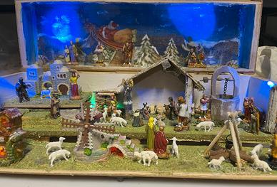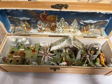 Presepe artigianale richiudibile in scatola di legno dimensione Lunghezza cm.34, L'interno tutto creato a mano con luci e suoneria disattivabili con due interruttori,