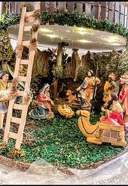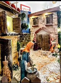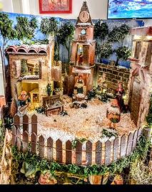 È una scena ricca di dettagli che combina la Natività tradizionale con un'ambientazione che sembra un piccolo villaggio in miniatura.Questo presepe è un esempio di artigianato curato, che crea un'atmosfera magica e tradizionale. Vendo PRESEPE interamente fatto a mano in modo arigianale completo di personaggi e luci ! Forma circolare a due piani