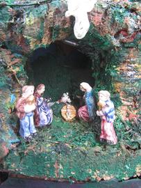 Presepe in vecchia cassa d'orologio con vetro convesso. Iconografia classica con grotta, taverna, rudere e scena pastorale. Illuminato da 5 lampade a pisellino, mini pastori (moschelle) da cm. 3,5 in ceramica e pecore. Può essere esposto sia su ripiano che a parete tramite gancio presente sul retro. Dimensioni: cassa ottagonale con lato cm. 14, coperchio circolare diametro cm. 37, vetro convesso diametro cm. 23, profondità cm. 12, peso kg. 3,2.