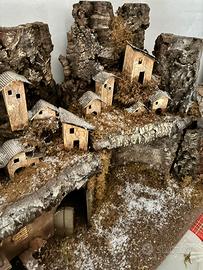 Presepe artigianale fatto a mano in legno, carta pesta, sughero e paglia.