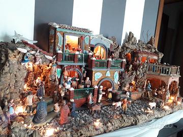 Composto da oltre 70 pastori (piu' della meta' sono da 12 cm e il resto da 8 cm ) tutti in terracotta realizzati a San Gregorio Armeno,oltre alle luci,2 fontane e scene in ogni ambiente ( macellaio,osteria,fornaio ect.) e minuteria.