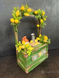 Banco dell’acquafrescaio in legno di balsa con miniature in cera. Per statue 12cm-14cm (h 18cm, lung. 10,5cm, prof. 5cm). Pezzo unico di artigianato realizzato a mano