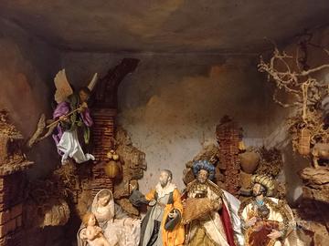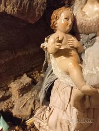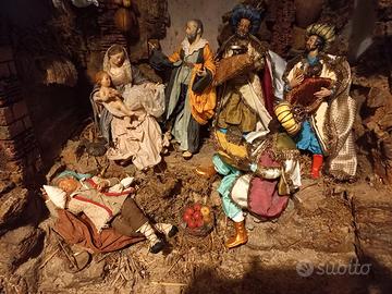 con occhi vetro, terracotta, stoppa, fil di ferro, stoffa ricamata- Giuseppe H cm 26- Maria H cm 23- Bambino H cm 12- Re Magi con oro, incenso e mirra H cm 27/H cm 27/ H cm 25- Benino dormiente H cm 24
