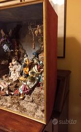 '900 - H cm 78 Prof cm 35 L cm 69 davanti L cm 61 dietro - cornice dorata- sui lati e sopra stoffa con piccola macchia sopra come da foto- sfondo dipinto a mano- legno, sughero, gesso,stoffa - contenente colonna, capitello, gallo, pecora, formaggio, cesto frutta