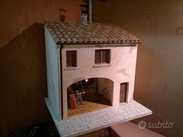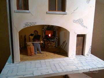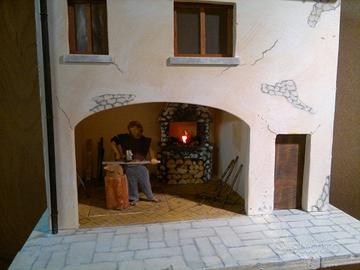 Fabbro animato (dimensione 12 cm) completo di edificio, artigianale e unico esemplare, curato in ogni dettaglio. Il tutto realizzato con una statua in resina, vestita a mano e con materiali vari. Il gruppo consiste in un edificio con due ambienti, il primo adibito a bottega e l’altro al piano superiore ad abitazione.