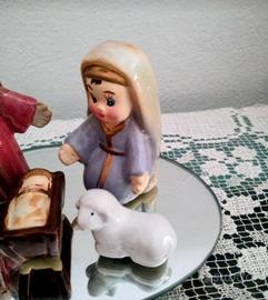 Presepe su base in specchio con piedini, la statuine si possono spostare perché non sono incollate...In ceramica.