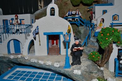 Presepe ambientato nell'isola greca di Santorini. Unico al mondo. Solo materiali naturali: cartoncino, legno, cartapesta, ecc... Le figure - modellate a mano - indossano abiti tradizionali di varie regioni della Grecia.