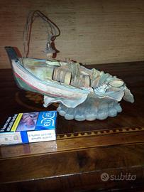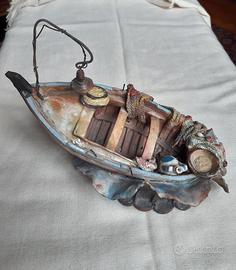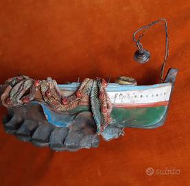 Gozzo con lampara antico in terracotta . Dimensioni : lunghezza da prua a poppa cm. 26, larghezza max cm. 13 altezza max cm. 18 Le foto fanno parte integrante della descrizione.