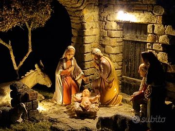 Vendo presepe popolare artigianale di dimensioni pari a 28 × 23 cm, ideale per piccoli spazi. Completo di statuine Landi Moranduzzo di altezza 10 cm. L'illuminazione del presepe è garantita attraverso 2 batterie tipo stilo in comodo contenitore con interruttore, quindi non necessita di collegamento alla rete elettrica. Data la fragilità dell'articolo preferisco scambio a mano.