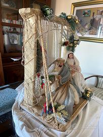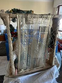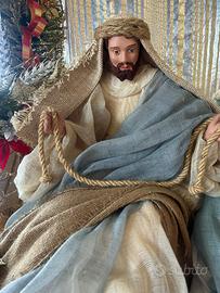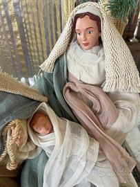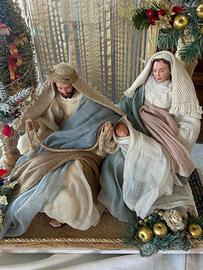 Presepe o presepio rappresentazione della Sacra famiglia in gesso dipinto e tessuto. In perfette condizioni. Ricco di dettagli. Il presepe è un pezzo unico. Dimensioni 70 x 65 x 40 cm. Molto bello e particolare.