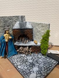 Scena presepiale per pastori da 10/12 cm, del classico forno. Illuminazione effetto fuoco a batteria Tutto fatto a mano in polistirene.