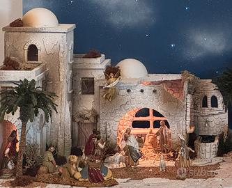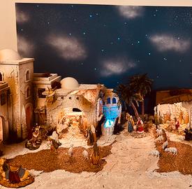 Vendo presepe stile arabo completo delle dimensioni di lunghezza 1,35 mt largezza 60 cm e altezza 40 cm completo di statue Landi/Moranduzzo 10 cm scala 1:20 e cielo stellato con fibre ottiche di lunghezza 1,35 mt.altezza 70 cm profondità 5 cm.Vendibile anche separatamente.