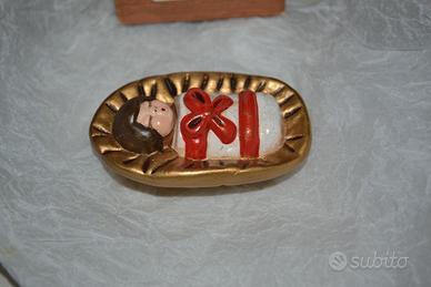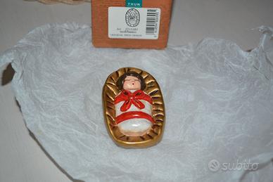 Vendo alcuni oggetti della mia collezione privata del Presepe Thun. In questo caso si tratta di Gesù bambino, colorazione rossa, con sua scatola originale. L'oggetto è stato usato ed è in buone condizioni. Mostra lievi tracce di usura nella parte sottostante come evidenziato in una foto. Vedete pure le altre mie inserzioni (non ho ancora inserito tutti i pezzi che si possono vedere in una con presepe quasi completo. (ad esempio ad ora devo ancora mettere in vendita i Magi, il resto della Sacra Famiglia, il bue, l'asinello ed altro). Grazie