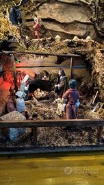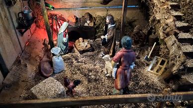 Presepe realizzato in una cassetta per la frutta anni '60, misure: H 30cm X L 50cm X P 30cm. Alimentazione 220v, due metri di cavo con interruttore, illuminazione a led, lampada effetto fuoco ,re magi compresi. Tutti i componenti sono incollati. Statuette da 9 cm.