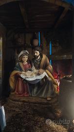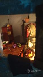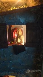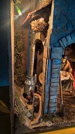 Presepe realizzato in una cassetta per la frutta anni '60 , misure H 30cm X L 50cm X P30 cm. Alimentazione 220 v ,due metri di cavo con interruttore, illuminazione a led, lampada effetto fuoco. Tutti i componenti sono incollati.