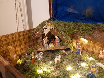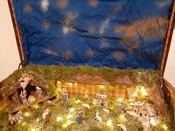 Presepio .rappresentato all interno di una vecchia vintage valigia. luci a led funzionanti. personaggi, sacra famiglia completa di bue e asinello, pastori,donne casette, pecore, muschio vero.