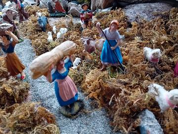 Vecchio presepio completo. 17 statuine di gesso di personaggi e 5 di animali da cortile. 2 statuine in cartapesa e alcune in resina. 9 casette, pozzo e ponte artigianali in sughero. Completo di legno/grotta fondale e carte dedicate.
