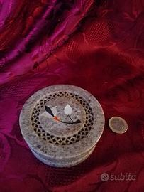 Preziosa scatolina-cofanetto con coperchio, in pietra naturale (un tipo pregiato di marmo), con delicato traforo e con decoro floreale in pietre diverse e madreperla intarsiate nel coperchio.