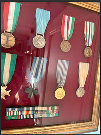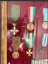 PREGIATO MEDAGLIERE, COLLEZIONE rappresentata da decorazioni militari italiane risalente principalmente alla Prima e Seconda Guerra Mondiale. Le medaglie includono onorificenze per servizio militare, merito di guerra e campagne specifiche, riflettendo la storia militare italiana del XX secolo. I nastri distintivi con i colori nazioni e altre combinazioni cromatiche identificano diverse campagne e riconoscimenti.