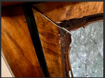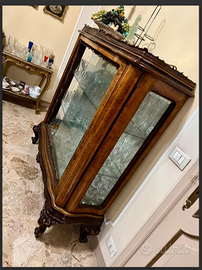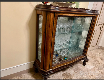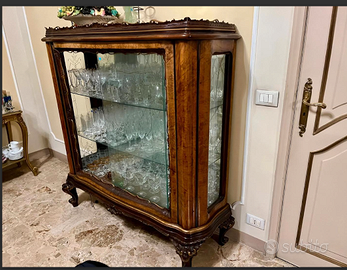 ESCLUSIVO e PREZIOSO mobile vetrina cristalleria con gambe "QUEEN ANNE" e intagli decorativi in stile CHIPPENDALE. Caratterizzata da elaborati intagli e ante scorrevoli in cristallo. Realizzata in radica di noce, le ante in cristallo permettono una perfetta esposizione di oggetti d'arte, porcellane o collezioni. Antica riconducibile ai Primi/Metà del '900. CONDIZIONI: ottimo stato conservativo ma essendo un articolo antico/vintage può presentare i lievi segni del tempo che ne attestano l'originalità e il fascino. Proveniente da collezione privata Villa Veneta del '900. (VEDI ULTIMA FOTO, ANGOLO da SISTEMARE, da qui il prezzo). MISURE: L130xh145xp42cm c.a. NOTE: Questo mobile vetrina rappresenta un esempio di artigianato italiano dell'inizio/metà del '900, che reinterpreta lo stile Chippendale inglese del XVIII secolo combinato con eleganti gambe "QUEEN ANNE". Realizzato in radica di noce con vetri intagliati, era destinato all'esposizione di cristalleria, porcellane e oggetti preziosi nelle case borghesi italiane del dopoguerra. La lavorazione artigianale e l'attenzione ai dettagli decorativi riflettono la tradizione ebanistica italiana dell'epoca. VISIBILE e RITIRABILE zona Treviso