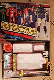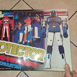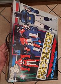 Protector Gordian set deluxe nuovo mai giocato. Accessori ancora sigillati completo di scatola con maniglia e vetrinetta Polistirolo e istruzioni perfetti. Robot vintage in metallo e plastica ,scatola 60× 40 .da collezione personale