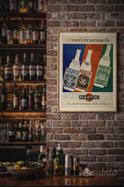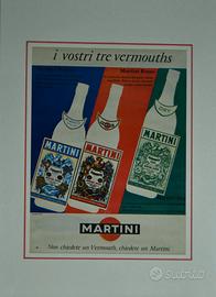 La grafica raffigura le tre varianti storiche del celebre vermouth italiano – Martini Bianco, Martini Rosso e Martini Dry – con lo slogan iconico: