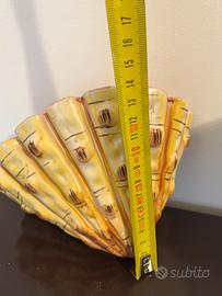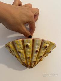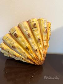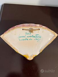 Acquasantiera o vaso da parete in ceramica dipinta con rifiniture dorate in rilievo a forma di conchiglia realizzato dalla celebre azienda perugina Pucci Umbertide.