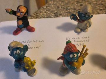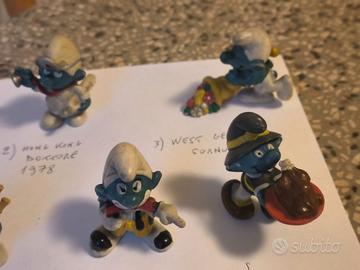 Gruppo composto da 7 tipi di Puffi originali marchiati "SCHLEICH PEYO", anni 70/80, in buone condizioni come da foto con alcune rarità. Il gruppo si compone dei seguenti personaggi: 1) Mago Gargamella (1982) - 2) Puffo dottore (1978) - 3) Puffo con cornucopia - 4) Puffo cacciatore (1978) - 5) Puffo con cornamusa - 6) Puffo Pagliaccio (Clown Smurf) code 20033 (1978) - 7) Puffo con pollo arrosto (1982). Riportano l'indicazione "W. BERRIE & CO. - MADE IN HONG KONG -" o West Germany. Prezzo cadauno 5 euro o 4 per gruppi di almeno tre soggetti. Eventuale vendita totale lotto 25 euro. Preferibile vendita e consegna diretta con pagamento in contanti per Milano e comuni del circondario. L'eventuale costo di spedizione è a carico dell'acquirente (preferibile eventuale spedizione e vendita direttamente con procedura di Subito).