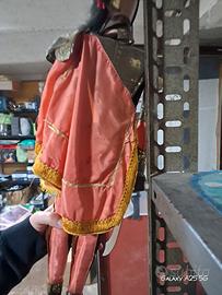 Il volto è dipinto a mano con i tratti distintivi della tradizione siciliana, come i baffi neri e lo sguardo fiero. Il vestiario include un mantello in raso color corallo con frange dorate, tipico delle rappresentazioni dell'Opera dei Pupi della metà del Novecento. L'oggetto conserva i ferri di manovra originali, necessari per il movimento scenico.