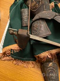 Vecchio pupo sicilianonh 50 cm circa da restaurare i tesduti non sono lacerati un pezzetto dell’armatura deve essere riposizionato : metallo tessuto e legno i materiali