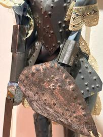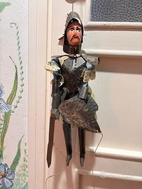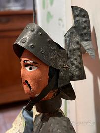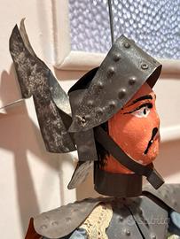 Splendido esemplare di marionetta da collezione, raffigurante un fiero cavaliere medievale con armatura completa in latta martellata e punzonata (effetto borchiato molto decorativo), elmo crestato con vistose “ali” laterali, viso in legno dipinto a mano con baffi neri iconici, sguardo truce e labbra rosse.