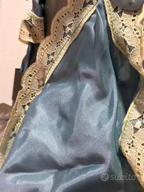 • Armatura in metallo anticato con inserti in tessuto satin blu-grigio e abbondanti pizzi e merletti vintage beige/avorio (tocco romantico e un po’ naif)
