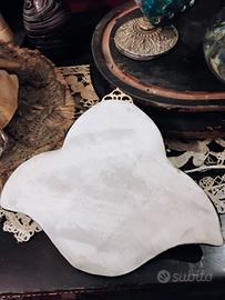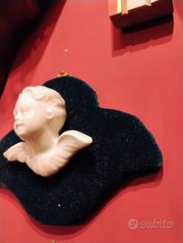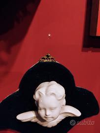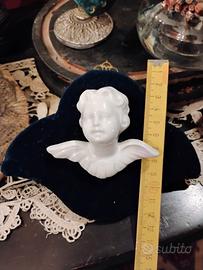 Decorazione vintage con putto, testa di angelo con ali in porcellana smaltata, modellato in rilievo e applicato su un elegante pannello rivestito in morbido velluto blu notte. Per chi ama le figure angeliche e il fascino senza tempo, capaci di portare luce e delicatezza in ogni ambiente. La sagoma del supporto richiama il giglio araldico, ispirato al simbolo antico di purezza e raffinatezza, mentre il volto angelico si ispira ai putti della tradizione artistica sacra, presenze silenziose, delicate, senza tempo Sul retro è presente il suo gancetto originale con lavorazione molto particolare, pronto per essere appeso. Eccellenti condizioni vintage solo lievissimi segni del tempo sul retro, invisibili una volta esposto. DIMENSIONI Largo 15,5 cm Alto 13 cm Spessore 4,5 cm Per ambienti shabby chic, case di campagna o interni dal gusto retrò Ideale per decorazioni romantiche e vintage pareti scenografiche, collezionisti di dettagli d’altri tempi, per creare un angolo sacro e raccolto, oppure un spazio romantico e intimo. Spedizione accurata e veloce NO Poste Italiane 🚫 oggetto di valore