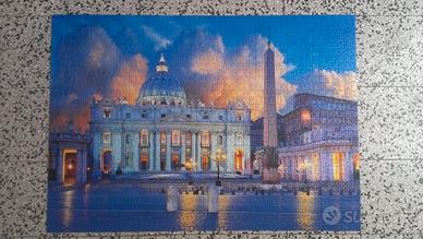 Puzzle 1500 Clementoni raffigurante San Pietro in Vaticano. Realizzato solo una volta e riposto nella scatola originale. La scatola presenta alcune imperfezioni dovute all'usura del tempo. Prodotto tenuto benissimo e ottimo per chi vuole realizzare un quadro... Posso spedire così come in foto o mettere i pezzi in un sacchetto. Non manca nemmeno un pezzo.
