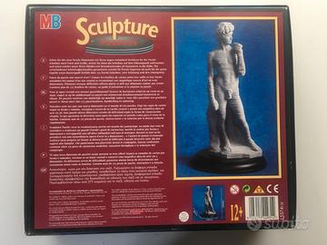 Puzzle della Sculpture Puzzles. La scatola ( dimensioni 32x27,5x09 cm circa ) contiene, oltre la base, i cartoncini ed i sostegni ( in confezioni ancora sigillate ) i pezzi necessari per realizzare il David di Michelangelo.