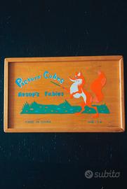 Puzzle in cubi di legno raffigurante le fiabe di Esopo. Ogni lato riproduce una figura diversa.