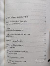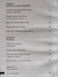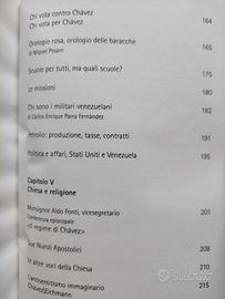 Autori vari: "Hugo CHÁVEZ E IL VENEZUELA" – A cura di Maurizio Chierici Nuova Iniziativa Editoriale (l'Unità), 2006 • collana "Quaderni dell'America Latina" 224 pagine • Alcune illustrazioni in b/n • Brossura con copertina illustrata Fuori commercio ---- INDICE: • La ricerca della democrazia per tutti • 60 anni nella storia del Venezuela. Le due verità della transizione Capitolo I – LA POLITICA E I PROTAGONISTI • Chávez figura controversa e polemica – di Jorge GIORDANI • Il ministro e la sua famiglia • «Perché ho sfidato Chávez». Rosales, l’avversario • Il Venezuela nel caminetto di Bush – di Maria Corina PETKOFF • Miami tiene d’occhio Caracas • Dal caffè nero alla tazza di latte – di Giulio SANTOSUOSSO Capitolo II – GIORNALI E TV, SPECCHI DEFORMANTI • Quando i media soppiantano i partiti – di Ernesto VILLEGAS POIJAK • Roberto Giusti, la voce contro. Siamo divisi, Chávez rivincerà • Radio e Tv, i padroni della notizia • Telesur, televisione meticcia • Uslar Pietri, l’intellettuale della politica Capitolo III – GLI ITALIANI • L’onorevole emigrante – di Marisa BAFILE • Gaetano Bafile, voce d’Italia • L’ex rettore della grande università. «Chávez? una tragedia» • Noi con Chávez, noi contro Chávez Capitolo IV – PANE E PETROLIO • La vita della gente • Chi vota contro Chávez. Chi vota per Chávez • Orologio rosa, orologio delle baracche – di Miguel POSANI • Scuole per tutti, ma quali scuole? • Le missioni • Chi sono i militari venezuelani – di Carlos Enrique PARRA FERNÁNDEZ • Petrolio: produzione, tasse, contratti • Politica e affari, Stati Uniti e Venezuela CAPITOLO V – CHIESA E RELIGIONE • Monsignor Aldo Fonti, vicesegretario Conferenza episcopale. «Il regime di Chávez» • Due Nunzi Apostolici • Le altre voci della Chiesa • L'antisemitismo immaginario. Chávez\Eichmann