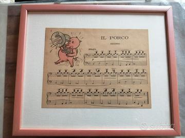 2 Quadretti con maialini, uno con un vecchio spartito (modernariato) di misurae 32×26,50; l'altro moderno di misure 32×23