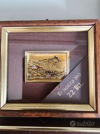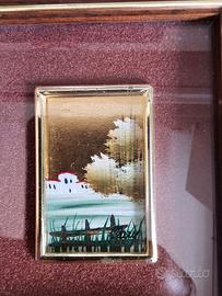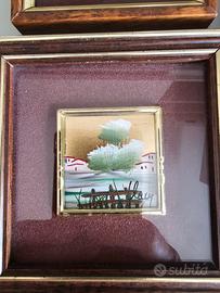 Vendo set di 4 quadretti d’arte miniatura, ciascuno incorniciato singolarmente con cornici in legno e dettagli dorati. Ogni opera rappresenta paesaggi o scorci cittadini, realizzati su sfondo dorato, probabilmente con foglia oro o finitura in oro 22kt (come indicato su uno dei pezzi). Ideali come decorazione elegante per soggiorno, studio o come regalo raffinato.