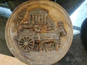 Vendo coppia di quadretti siciliani rotondi raffiguranti i famosi carri allegorici anni 50/60 in gesso diametro 18 cm ,in discrete condizioni