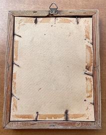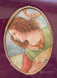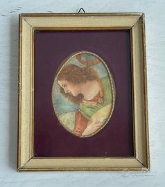 quadretto vintage con immagine di angioletto musicante riprodotta su tessuto. Cornice in legno con vetro e passe-partout fucsia di velluto, misura cm.13 x 17 vendesi euro 10