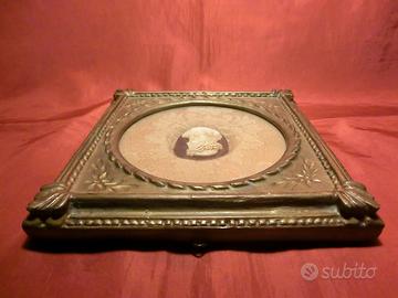 Descrizione: Quadretto ottocentesco di forma quadrata, con cornice lignea dorata riccamente decorata da motivi vegetali stilizzati e cornici modanate. Il vetro, originale, protegge l’interno, costituito da un’imbottitura rivestita in seta damascata color oro, decorata da motivi floreali regolari. Al centro della composizione è fissato un cammeo ovale, montato su fondo scuro (blu profondo), raffigurante il profilo del volto di Cristo rivolto verso destra. Il soggetto è reso con grande raffinatezza formale: i capelli lunghi e ondulati, la barba fluente e la corona di spine sono trattati con un’eccezionale perizia tecnica, che evidenzia la padronanza dell’intaglio a rilievo e del chiaroscuro plastico. La resa anatomica del volto, la delicatezza dei passaggi tonali e la precisione delle incisioni suggeriscono l’opera di un incisore altamente specializzato, probabilmente attivo in un contesto artigianale di alto livello. L’insieme presenta un forte valore devozionale e una chiara ispirazione all’iconografia cristologica di tradizione neoclassica. Quadretti con cammei di soggetto religioso furono particolarmente diffusi nel corso dell’Ottocento, sia come oggetti devozionali privati sia come testimonianza del gusto neoclassico per l’arte glittica. La qualità dell’intaglio del cammeo e la cura dell’allestimento suggeriscono una committenza colta e un contesto produttivo di pregio.