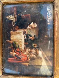 Quadretto decorativo vintage con scena di taverna in stile pittura fiamminga.