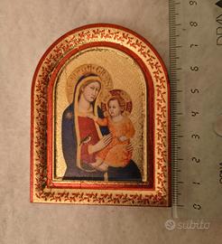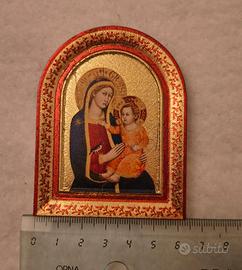 Bella immagine sacra della Madonna con Bambino, con cornice dorata e decorazioni rosse.