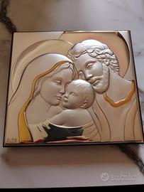 Splendido quadretto Sacra Famiglia firmato Camilletti Argenterie, realizzato in lamina dāargento con inserti colorati e base in legno. Un oggetto di grande eleganza e significato, ideale come regalo per battesimo, matrimonio o anniversario, oppure come raffinato elemento dāarredo per la casa.