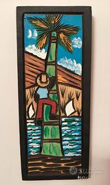 Coppia di quadretti in legno con immagini scolpite a rilievo. Il piccolo misura 10x25 cm. Il grande 9x50 cm.