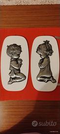 figure di metallo su supporto di legno bianco, da appendere.