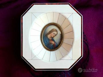 N° 3 Mini quadro con cornice in avorio quasi quadrata con incavo ovale a spicchi bordato in ottone con in miniatura di Madonna ovale dipinta a mano di una bellezza inaudita, protetta da un vetro ovale bombato.