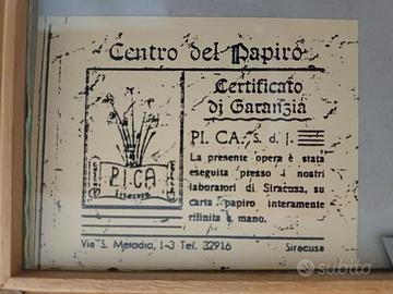 1. Due quadretti di arte siracusana d'eccellenza. Dipinti a mano su papiro, con soggetti di ispirazione greca antica. Molto molto belli.